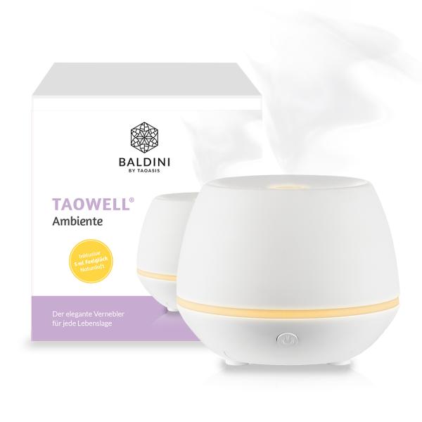 Der TaoWell® Ambiente mit der bewährten TaoWell®-Technik im schlichten Design ist modernes Dekoelement und duftender Alltagsbegleiter in Einem. Die Ultraschallverneblung sorgt für eine schonende Kaltverdampfung der Öle und damit für eine besonders feine Verteilung des Duftes im Raum. Während des Betriebs leuchtet ein sanftes Licht, das je nach Vorliebe auch ausgeschaltet werden kann.